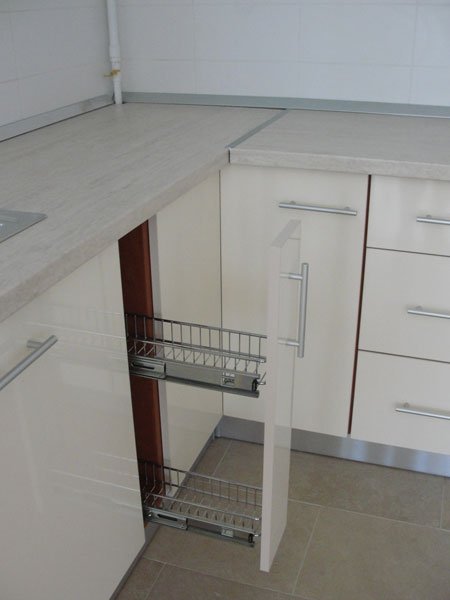 Este formata din: la partea inferioara: masca chiuveta 900x500x850 mm, corp cos Jolly cu latimea de 200 mm, corp colt 800x800x850 mm, corp 3 sertare 400x500x850 mm, corp aragaz si cuptor cu latimea de 600 mm si corp pentru vase cu latimea de 700 mm. Partea superioara are in componenta: corp superior cu 2 usi cu latimea de 800 mm (prevazut cu scurgator de vase), corp cu usa de sticla satinata (rama metalica) cu latimea de 300 mm, corp hota si corp cu usi batante cu latimea de 700 mm.